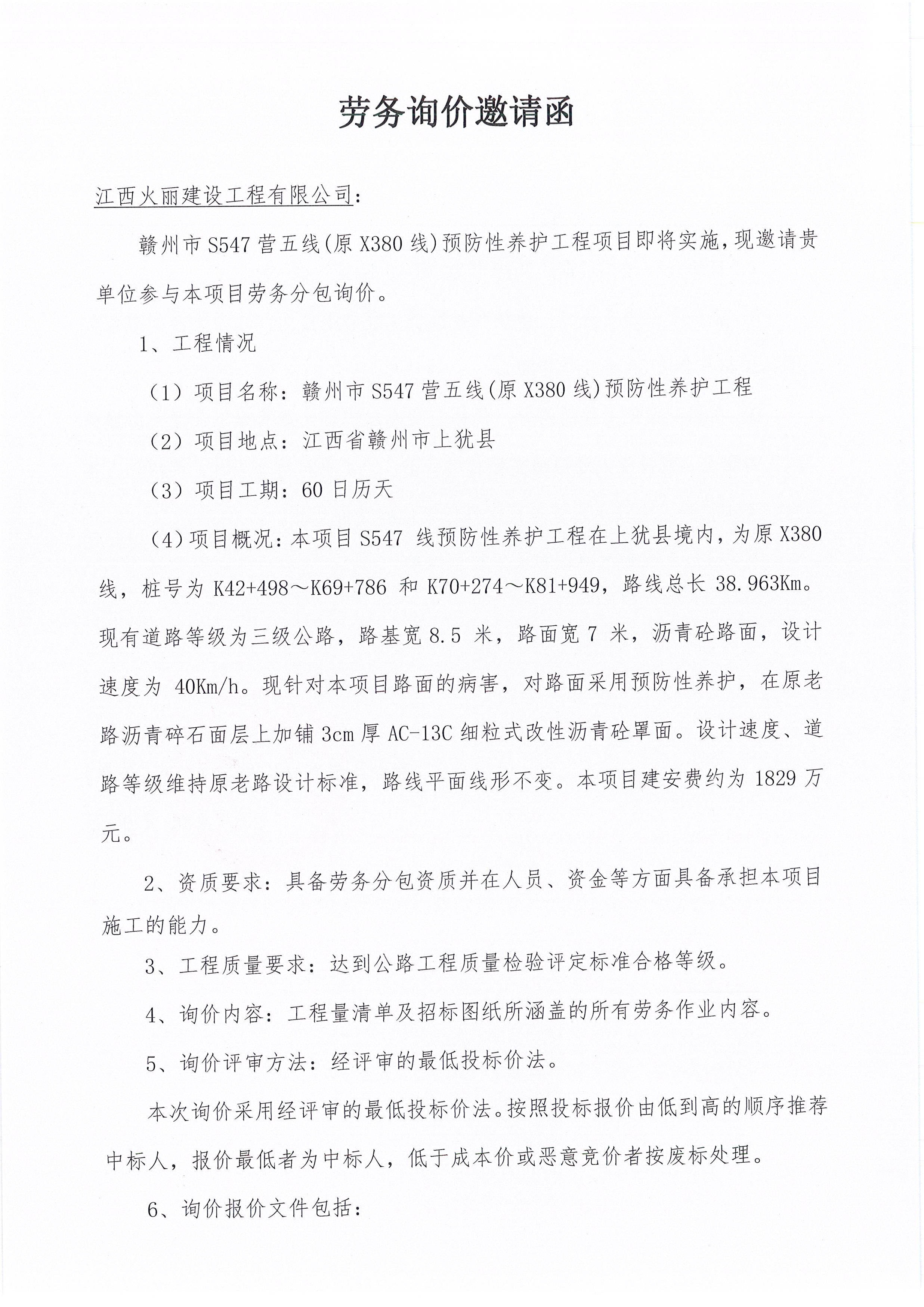 贛州市S547營五線(原X380線)預(yù)防性養(yǎng)護工程勞務(wù)詢價邀請函