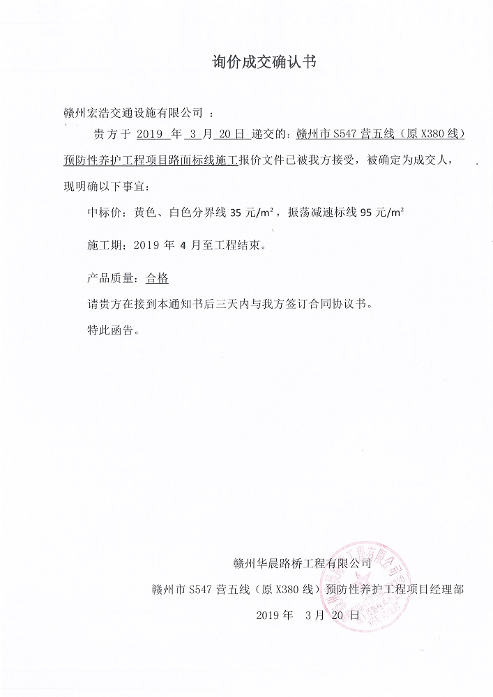 贛州市S547營(yíng)五線(原X380線)預(yù)防性養(yǎng)護(hù)工程項(xiàng)目路面標(biāo)線施工詢價(jià)成交確認(rèn)書