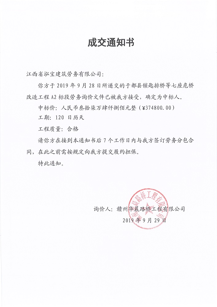 于都縣鎖匙排橋等七座危橋改造工程A2標段勞務詢價成交確認書