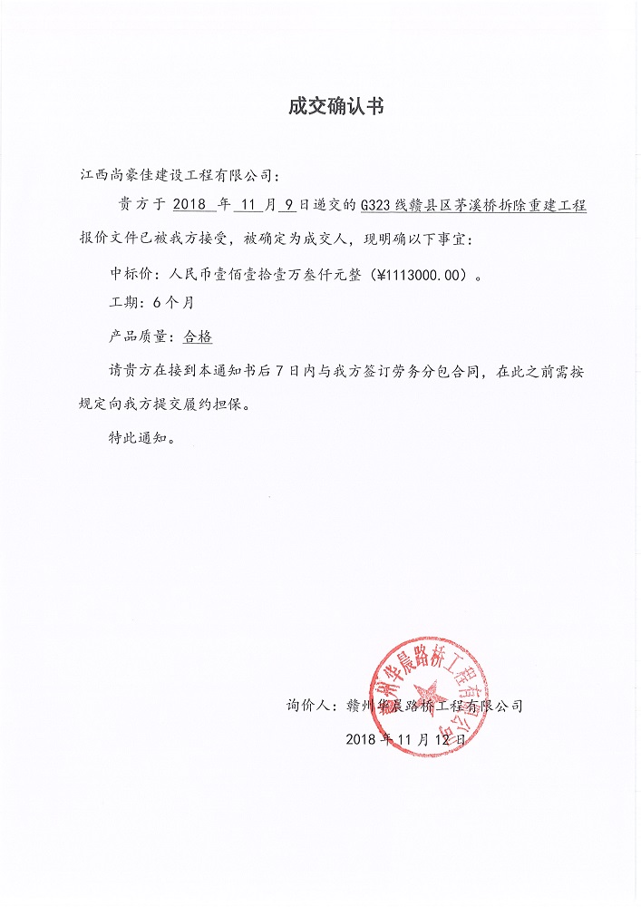 G323線贛縣區(qū)茅溪橋拆除重建工程勞務(wù)詢價(jià)成交確認(rèn)書