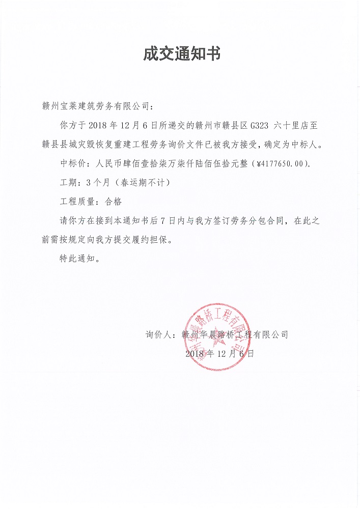 贛州市贛縣區(qū)G323 六十里店至贛縣縣城災(zāi)毀恢復(fù)重建工程勞務(wù)詢價成交確認(rèn)書