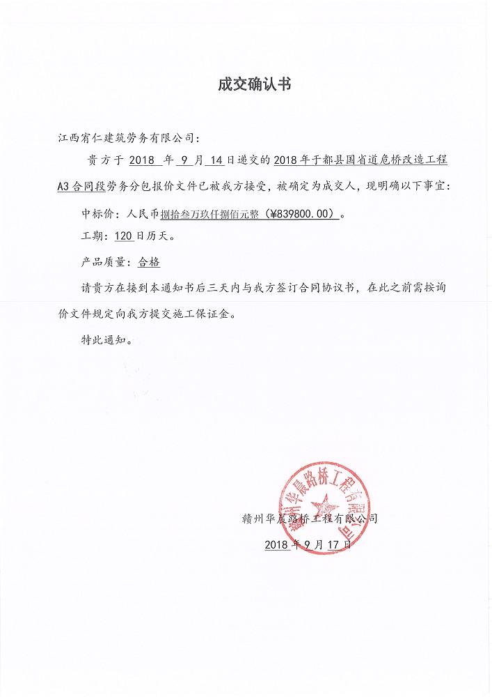 2018年于都縣國省道危橋改造工程A3合同段勞務(wù)詢價(jià)成交確認(rèn)書