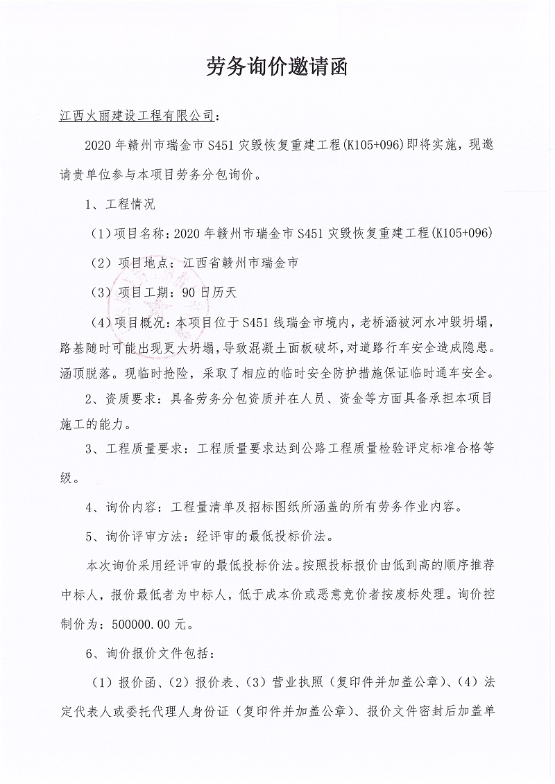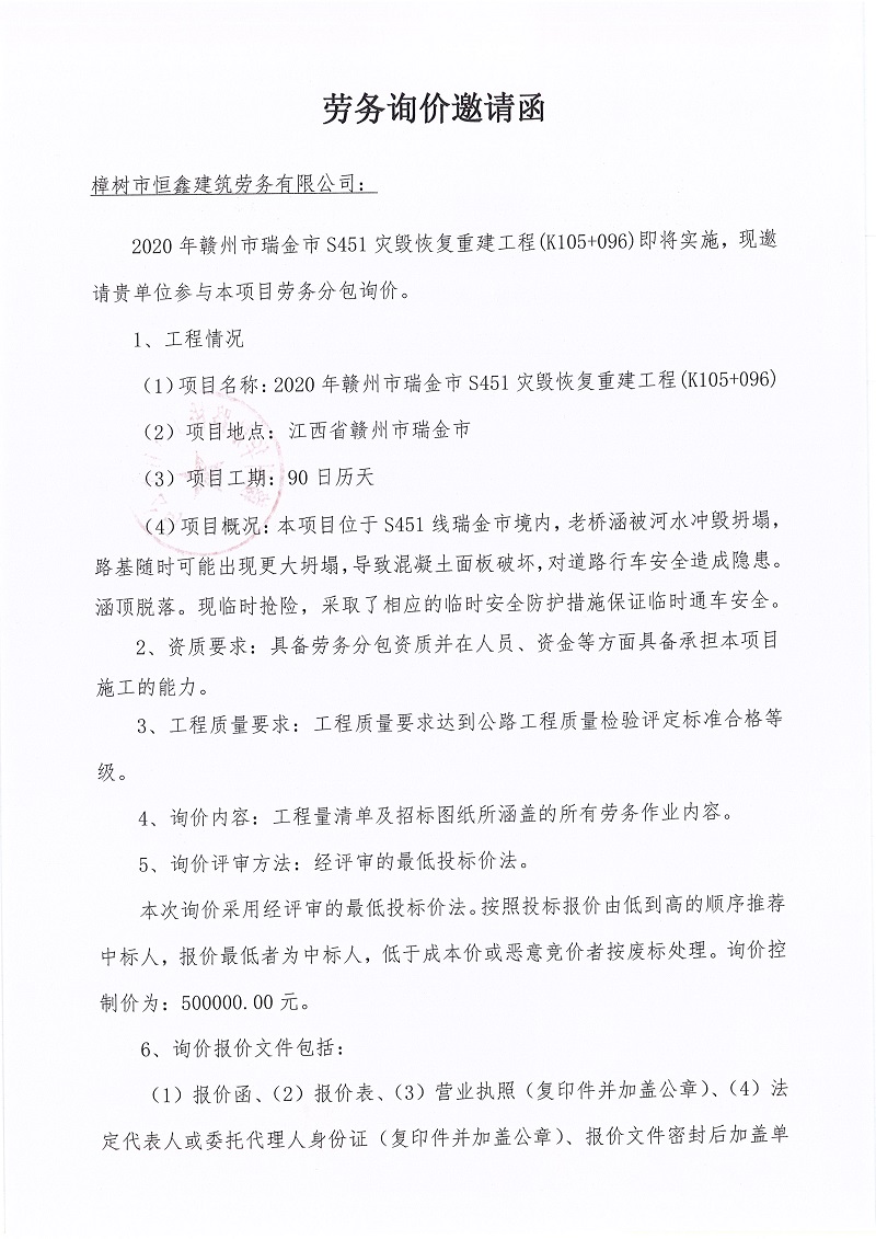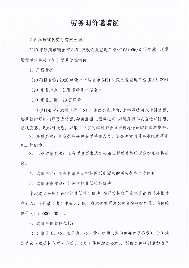 2020年贛州市瑞金市S451災(zāi)毀恢復(fù)重建工程(K105+096)勞務(wù)詢價邀請函