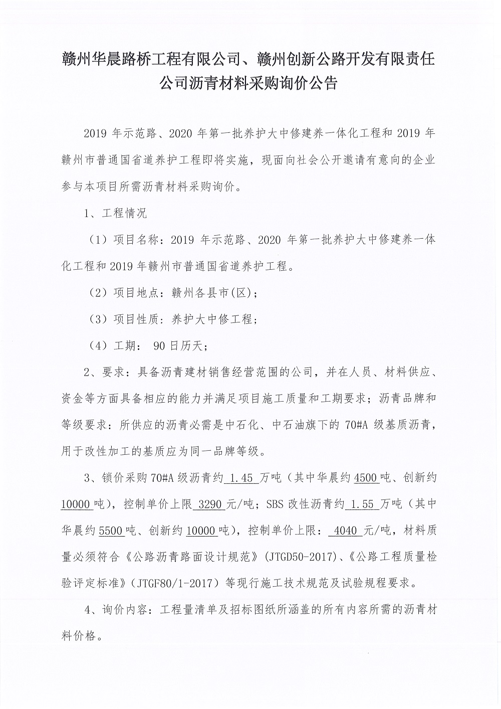 2019年示范路、2020年第一批養(yǎng)護(hù)大中修建養(yǎng)一體化工程和2019年贛州市普通國(guó)省道養(yǎng)護(hù)工程瀝青詢價(jià)文件