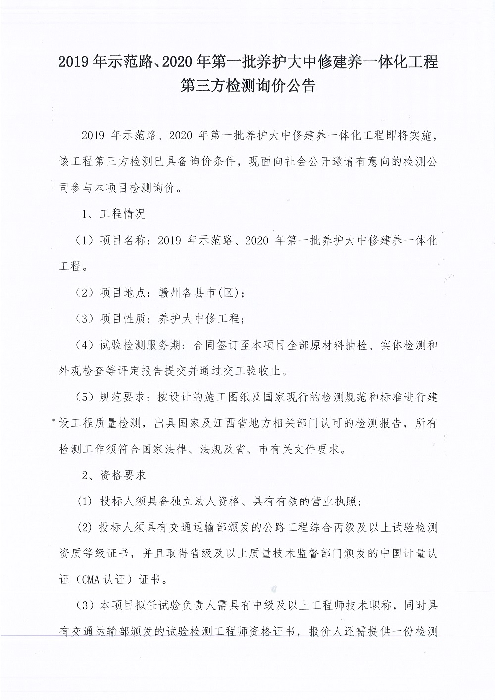 2019年示范路、2020年第一批養(yǎng)護(hù)大中修建養(yǎng)一體化工程第三方檢測(cè)詢價(jià)文件