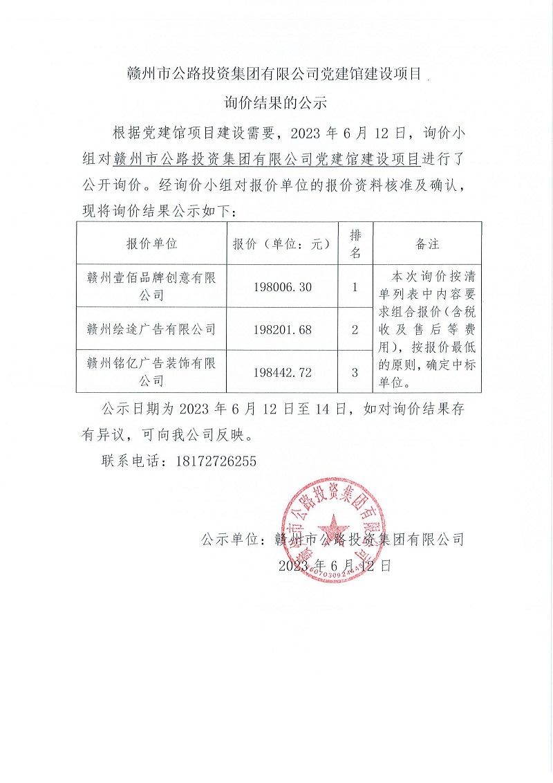贛州市公路投資集團有限公司黨建館建設(shè)項目詢價結(jié)果公示